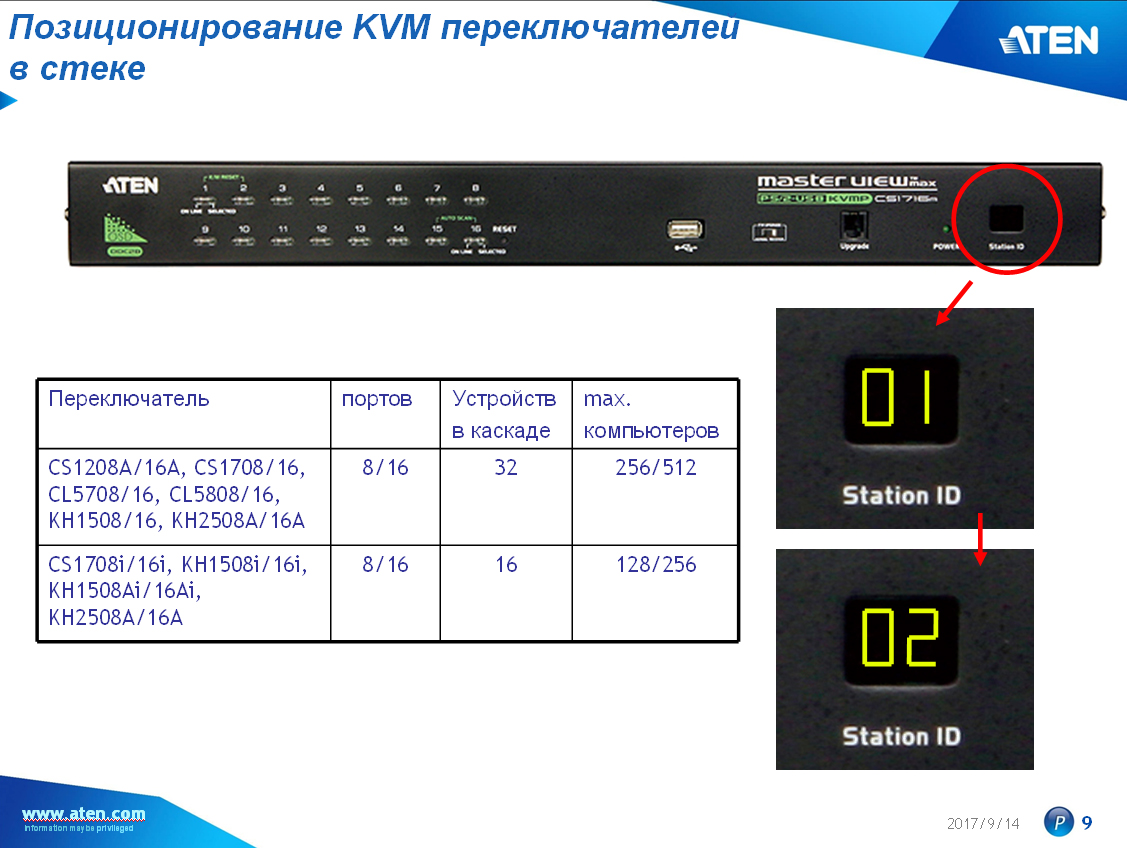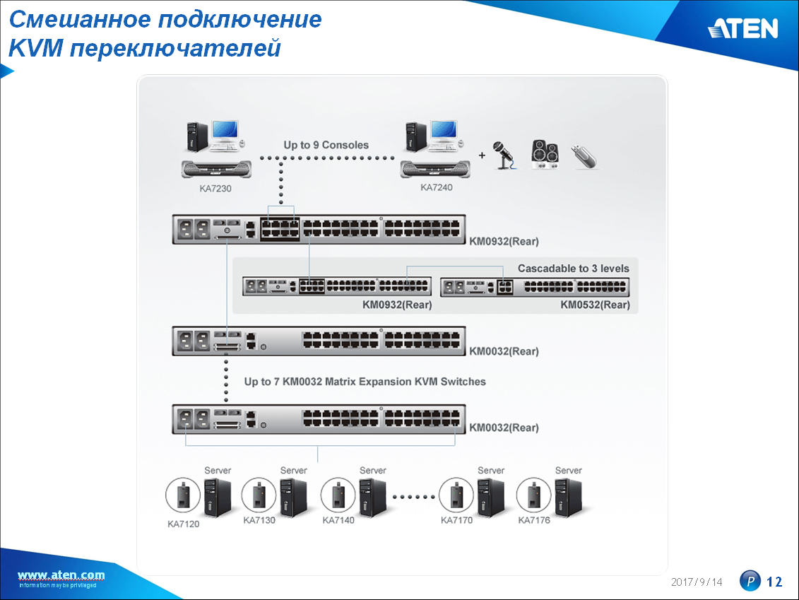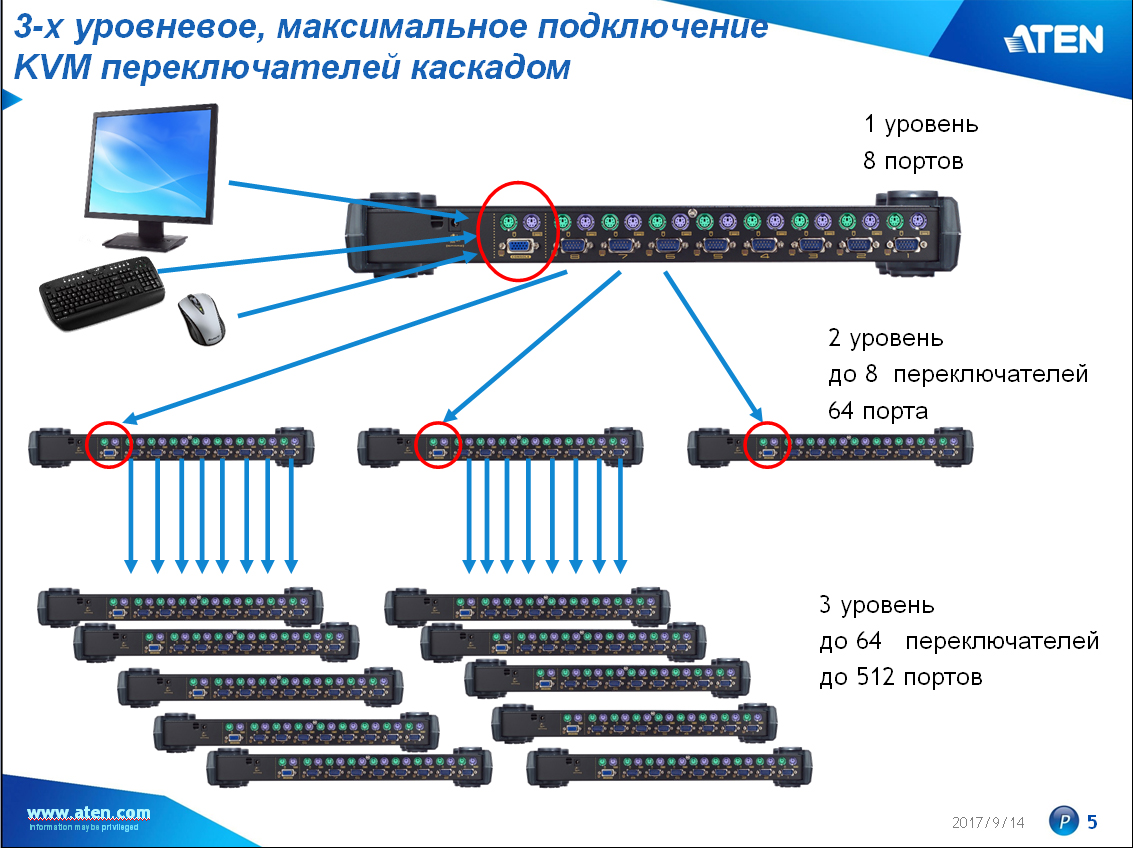 KVM-переключателями первого уровня при каскадировании могут быть переключатели с интегрированной консолью управления (клавиатура / видео / мышь) или IP модулем, "выше" подключать нет смысла, так как доступ с консоли удаленного компьютера к переключателю по IP представляет собой рабочее место оператора (точку входа или доступа к системе). Однако, для объединения IP KVM под управление с единой консоли в одном помещении (например, ЦОД) компания ATEN предусмотрела переключатели более высоко уровня – "матричные KVM".