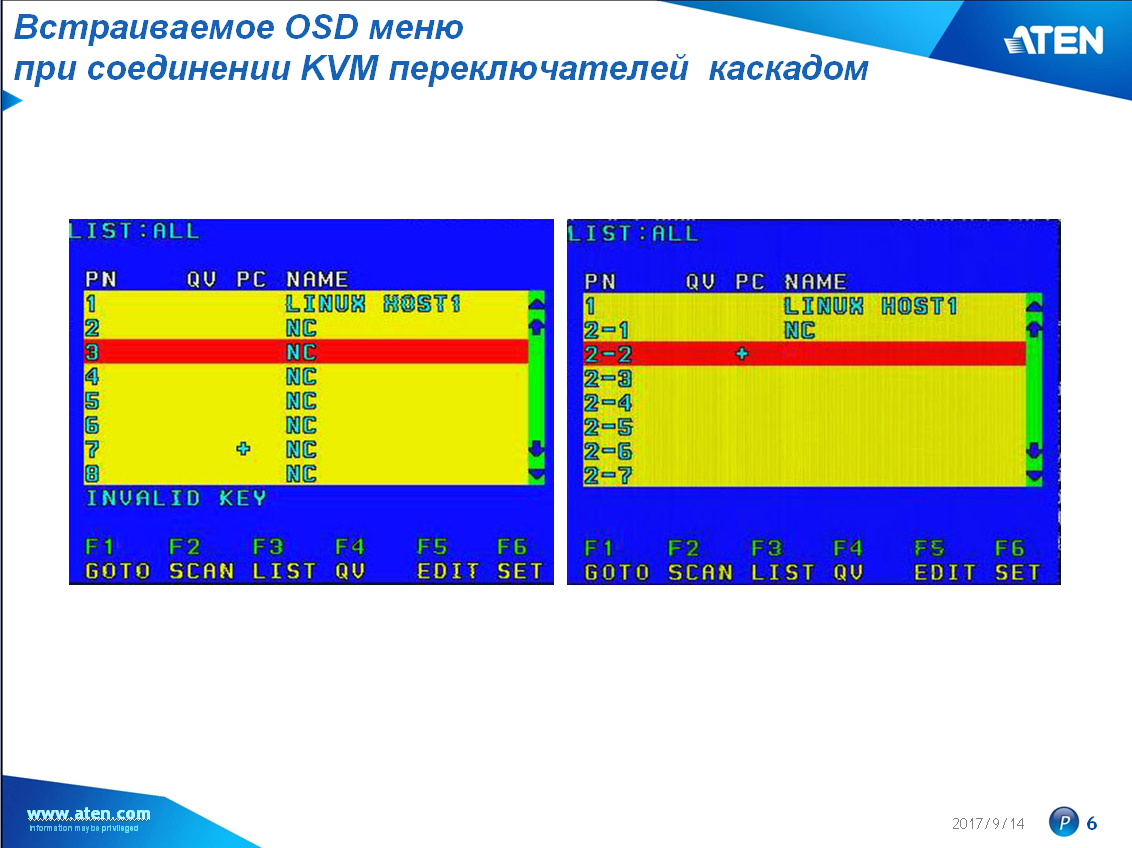 При таком подключении максимальное количество подключаемых серверов – 512 при использовании 73 KVM-переключателей ATEN CS9138. При управлении таким количеством серверов просто невозможно удержать в памяти, что к чему подключено и через какой порт в какой цепочке можно соединить KVM-консоль оператора с KVM-интерфейсом сервера. Для решения этой задачи компания ATEN предусмотрела возможность встраиваемых меню.