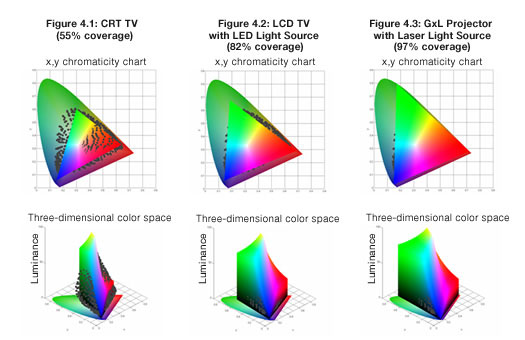На самом деле существует много цветовых оттенков за переделами стандартного "треугольника цветов", описанного в Rec.709, которые видит наш глаз, но не может воспроизводить телевизор. Например, некоторые эксперты считают, что ни один телевизор не способен правильно отобразить цвет баклажана. С другой стороны, ведущие компании-изготовители ТВ (точнее, их отделы маркетинга) возразят вам, что уж их-то телевизоры показывают все в точности, так как обладают "ультра-широкой цветовой палитрой" или чем-то в этом роде. Однако же, искусственное расширение палитры способно сделать изображение на экране "мультяшным". Действительно, если в исходном видеосигнале имеется красный цвет, то таковым он должен быть и на экране, без добавления несуществующих в природе оттенков. Подобное преобразование позволит произвести впечатление на публику при демонстрациях ТВ на выставках и в демо-залах, но вряд ли будет полезным при ежедневном просмотре телевизора в домашних условиях. Поэтому внимательно смотрите на точность цветопередачи при выборе телевизора.