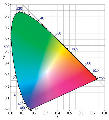 То, что выглядит идеально красным для меня, может иметь морковный (оранжевый) или свекольный (пурпурный) оттенок для вас. Восприятие цвета субъективно, поэтому здесь необходимо выработать четкие стандарты. Если этого не сделать, то о единых стандартах телевидения можно просто забыть. В 1990 году на свет появился стандарт Rec.709 (или Рекомендация ITU-R BT.709), который четко определил красный, зеленый и синий цвета для формата HDTV. Они описывались значениями X и Y (координатами) точек на диаграмме CIE (Commission Internationale de l'Eclairage – международная комиссия по освещению, основная международная организация, занимающаяся цветом и измерениями цвета) (см. рис. 3). Эта диаграмма представляет собой цифровое обозначение цветов, и она позволяет стандартизировать определение любого цвета, исключив элемент субъективного восприятия цвета человеком. Благодаря этому телеоператоры и кинорежиссеры могут быть уверены, что те цвета изображения, которые снимают их камеры, будут в точности воспроизведены на экранах ТВ и в кинозалах. Разумеется, в реальности все не так прекрасно, но, по крайней мере, такова была идея. На каждом этапе обработки и передачи видеосигнала цвета могут искажаться, и точность их формирования легко проверить на таких природных объектах, истинный цвет которых вам хорошо известен – например, зеленый цвет футбольного газона или телесный цвет человеческих лиц. Тем не менее, лучшие модели телевизоров обладают почти идеальной точностью цветопередачи "внутри" треугольника "красный/зеленый/синий", а их характеристики полностью соответствуют необходимым стандартам.