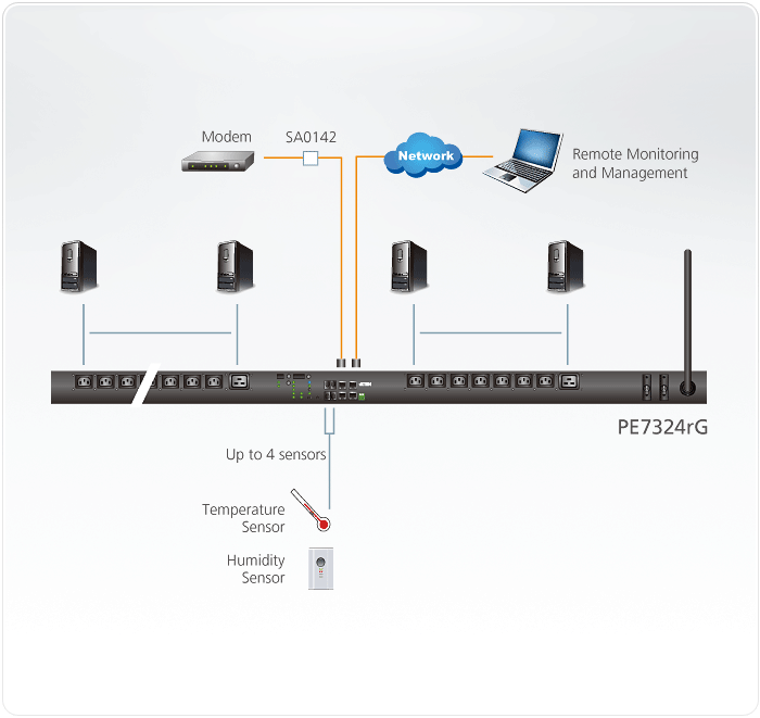 Чтобы точнее контролировать состояние оборудования, продукты серии PE5XX/PE7XX предусматривают не только измерение параметров электропитания, но и поддерживают внешние датчики температуры и влажности, оповещая о превышении пороговых значений. Предупреждающие сообщения могут рассылаться через почтовый сервер SMTP или в виде SMS (через порт Digital Output устройства), а использование системы управления Altusen CC (Control Center Over the NET) позволяет полностью управлять электропитанием и устройствами KVM серии KVM Over the NET из единого интерфейса.