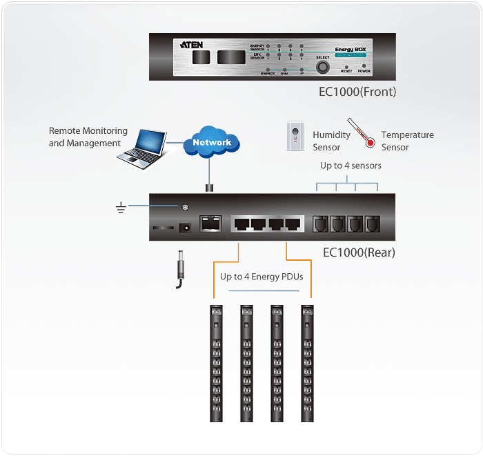 Cерия устройств PE5ХХХ/PE8ХХХ выполнена как в горизонтальном, так и в вертикальном исполнении. Возможности данных устройств отражены в "Серии PDU производства ATEN." У всех устройств предусмотрен самостоятельный доступ в сеть (сетевая карта). К любому устройству подключаются датчики температуры, влажности и дифференциального давления, а также возможен мониторинг состояния питания. Через устройства PE6ХХХ/PE8ХХХ серий ведется управление розетками. Доступ к устройствам возможен через браузеры или систему централизованного управления CC2000.